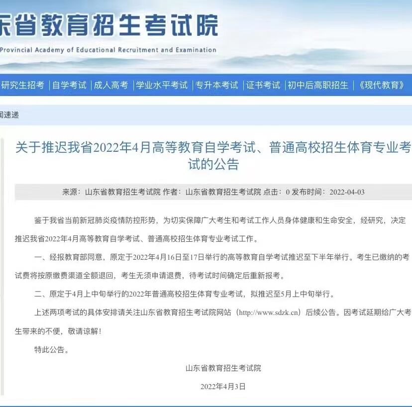 关于推迟山东省2022年4月高等教育自学考试的通知