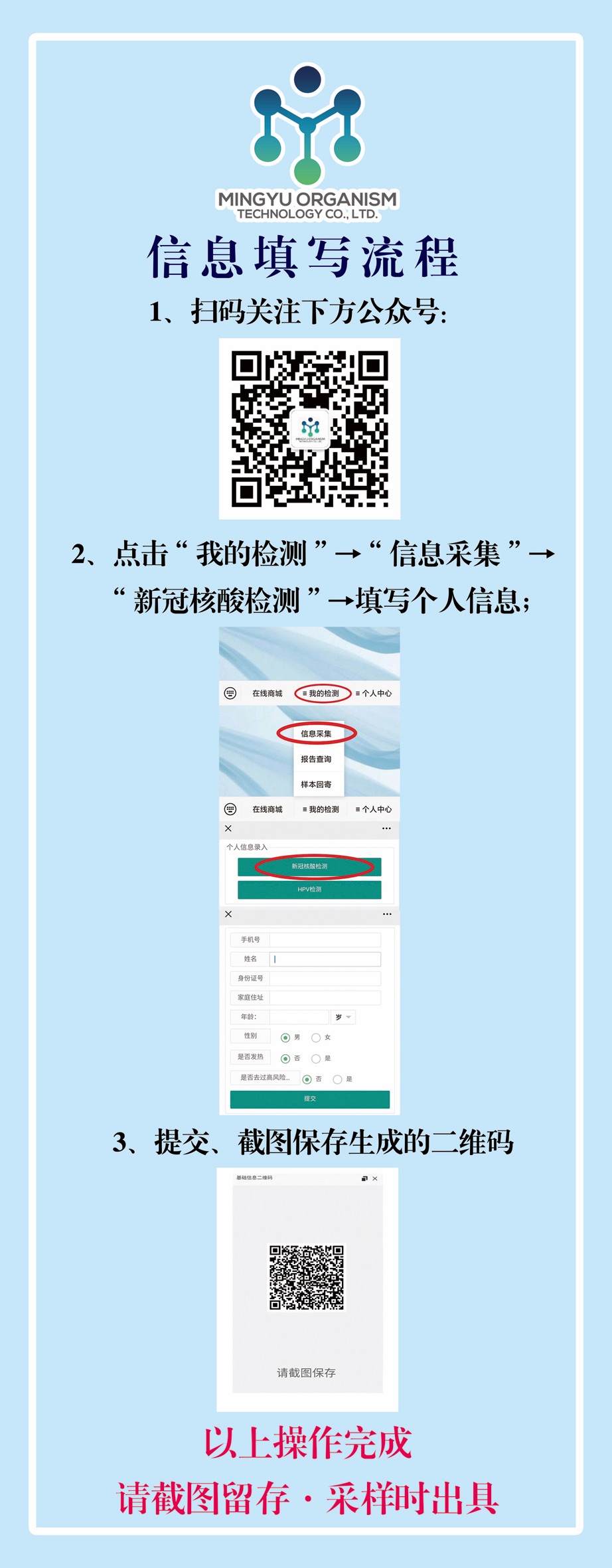 考生需提前扫描以下二维码采集个人信息,并在检测时出示生成的二维码。请注意一定填写好正确的身份证号、手机号码,否则无法查询检测结果。请需要进行核酸检测的考生做好个人防护按时到指定地点进行检测。